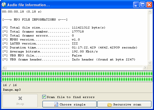 With this button you can scan a single audio file. When you press "Choose single" an open dialog window appear, with the list of all supported audio file extension. If you select an audio file and click "Ok", it will be scanned and informations extracted will be displayed into the main textbox pane. If deep scan audio files to find errors is checked, audio file will be scanned deeply.