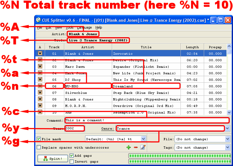 - %c - Album comment. In this example, token %c will be replaced with "This is a comment!".