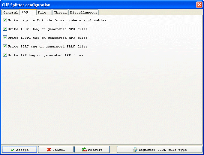 If you check this option, APEv2 tag is written at the end of each generated APE file. APEv2 support only Unicode format (using UTF-8 encoding). [Default = checked].